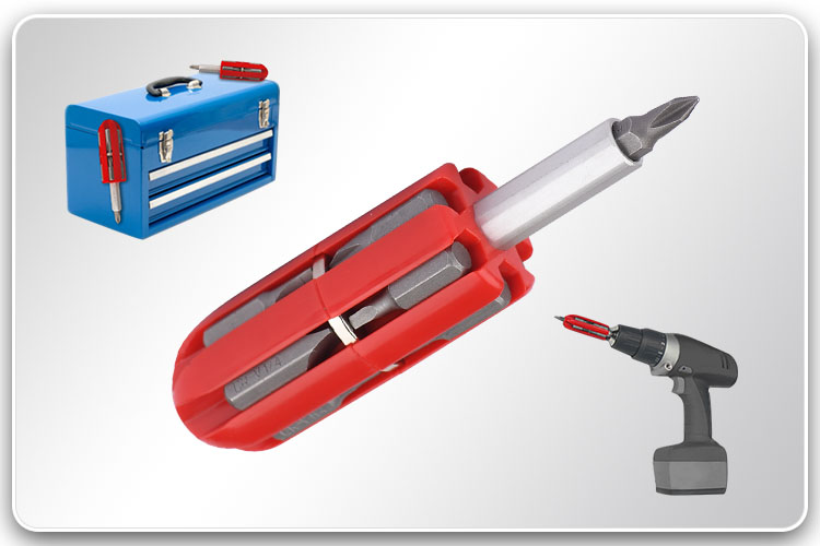 Scruzol's 12 top-quality bits slide freely in their open-sided storage slots and snap securely onto the central magnet in its handle. This compact bit-storage system enables fast bit-swapping with a flickable tactile feel. The same powerful magnet that energizes a Scruzol's bit-storage system also enables the handle to be stored like a fridge magnet. Highly magnetized bits enable easy single-handed operation.